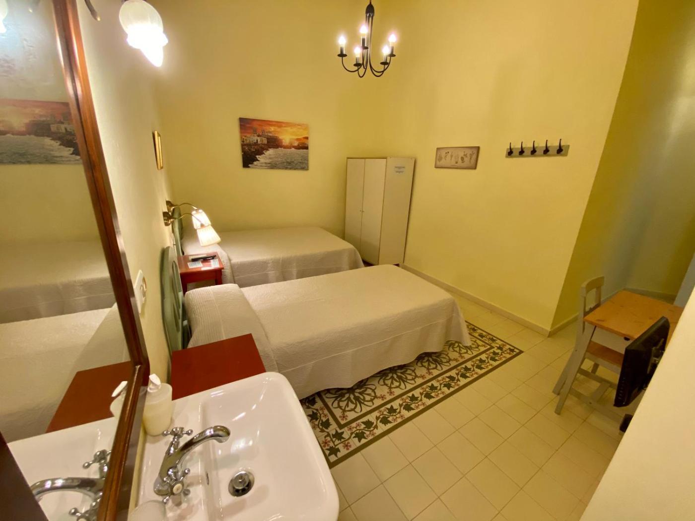 Twin Room with Shared Bathroom. This room features tiled floors and pastel colours. It has a fan. The bathroom is shared. ;