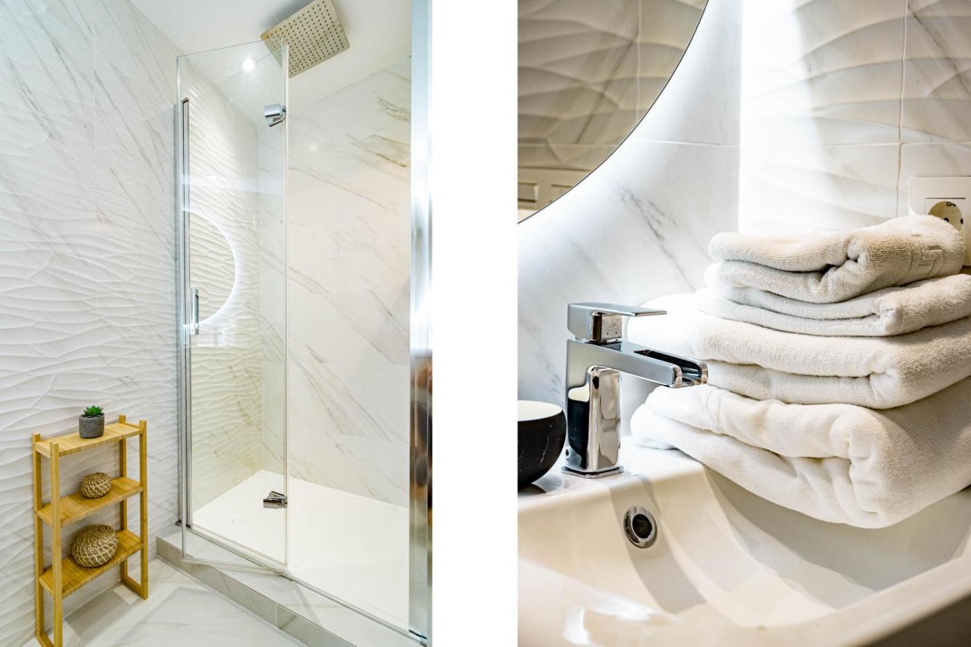 Three-Bedroom Apartment. This spacious apartment consists of 1 living room, 3 separate bedrooms and 2 bathrooms with a walk-in shower and a hairdryer. Guests can make meals in the kitchen that is equipped with a stovetop, a refrigerator, a dishwasher and kitchenware. This air-conditioned apartment comes with a dining area, a flat-screen TV with streaming services a washing machine and a terrace. The unit offers 4 beds.